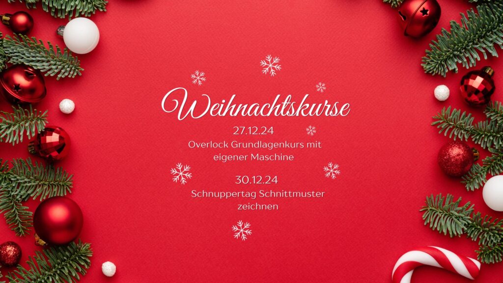 Zwischen den Jahren kreativ werden… ast auch du Ferien zwischen Weihnachten und Neujahr? Perfekt, um etwas Neues auszuprobieren oder deine Fähigkeiten zu vertiefen! Informiere dich jetzt über unsere Weihnachtskurse. 27.12.2024 – Overlock Grundlagenkurs 30.12.2024 – Schnuppertag Schnittmuster zeichnen Bist du auch dabei? Wir freuen uns auf dich!