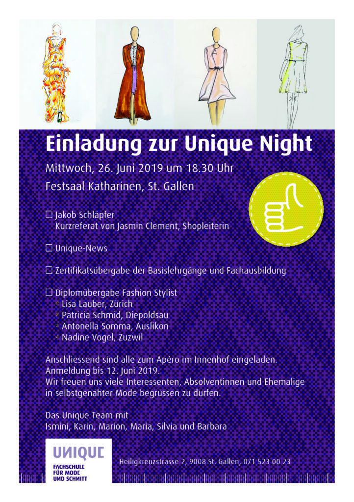 An der 1. Unique Night vom 26. Juni 2019 durften knapp 50 Teilnehmerinnen ihre Zertifikate in Empfang nehmen. Vier von ihnen haben nun alle vier Basislehrgänge erfolgreich absolviert und erhielten ihr Diplom Fashion Stylist. Wir gratulieren herzlich! Antonella Somma, Auslikon Lisa Lauber, Zürich Patricia Schmid, Diepoldsau Nadine Vogel, Zuzwil